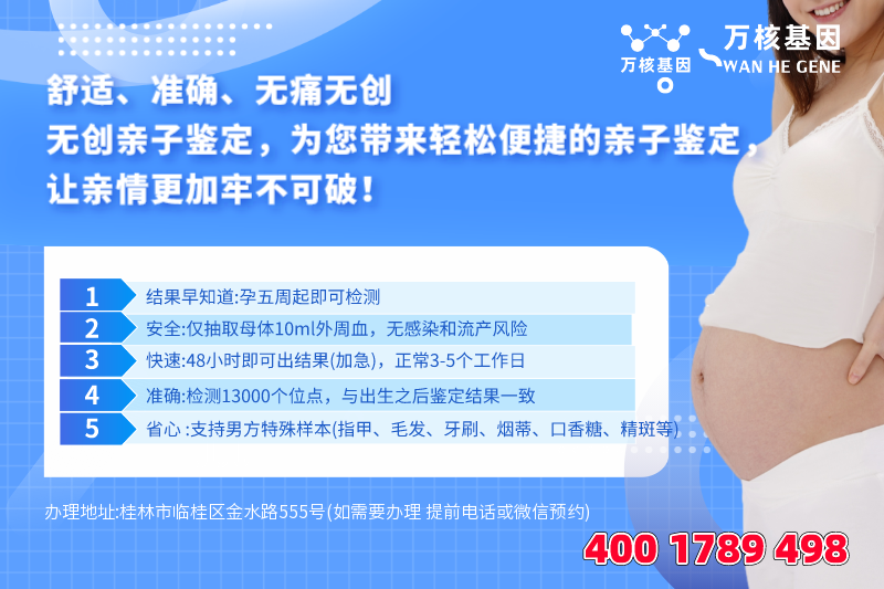 非侵入式的孕期亲子鉴定是当前经常使用的一种方式。它不需要进行侵入式手术治疗,只通过孕妈妈的血液样本,就能获取胎儿的DNA开展检测。这类方法对孕妇和胎儿的安全性至关重要,也更加遭受人们的喜爱。并且,dna胎儿亲子鉴定的命中率也十分高,能够检测13000结构域,确保鉴定报告精确靠谱,一般7个工作日日结果出来。那么,在桂林临桂做dna胎儿亲子鉴定去哪里做呢?